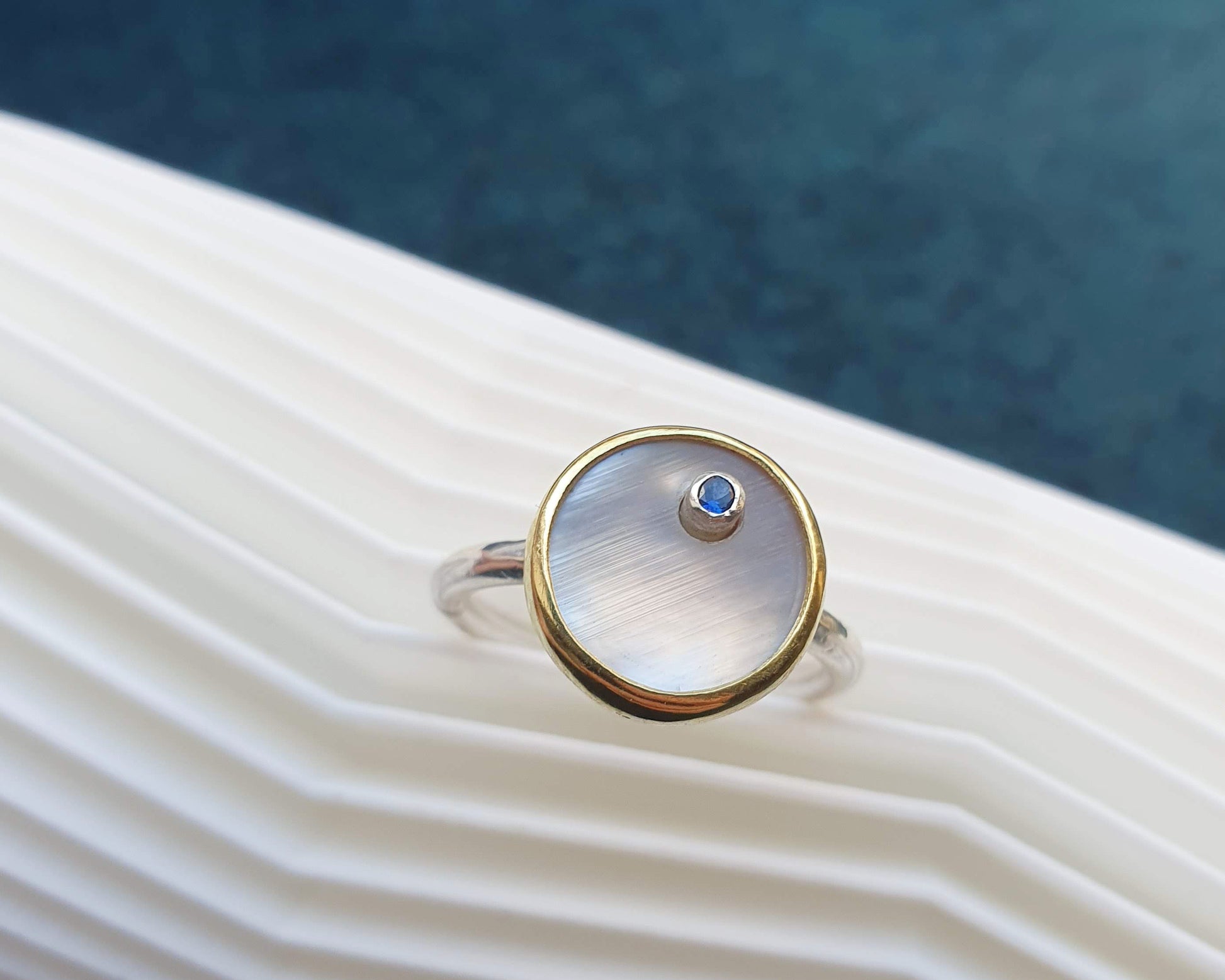A one off and completely unique ring from Inplico. Handmade from solid silver with a brass setting. Set with mother of pearl with a stunning blue sapphire. The grey undertone of the pearl in this ring makes it a real eye catcher in the light.