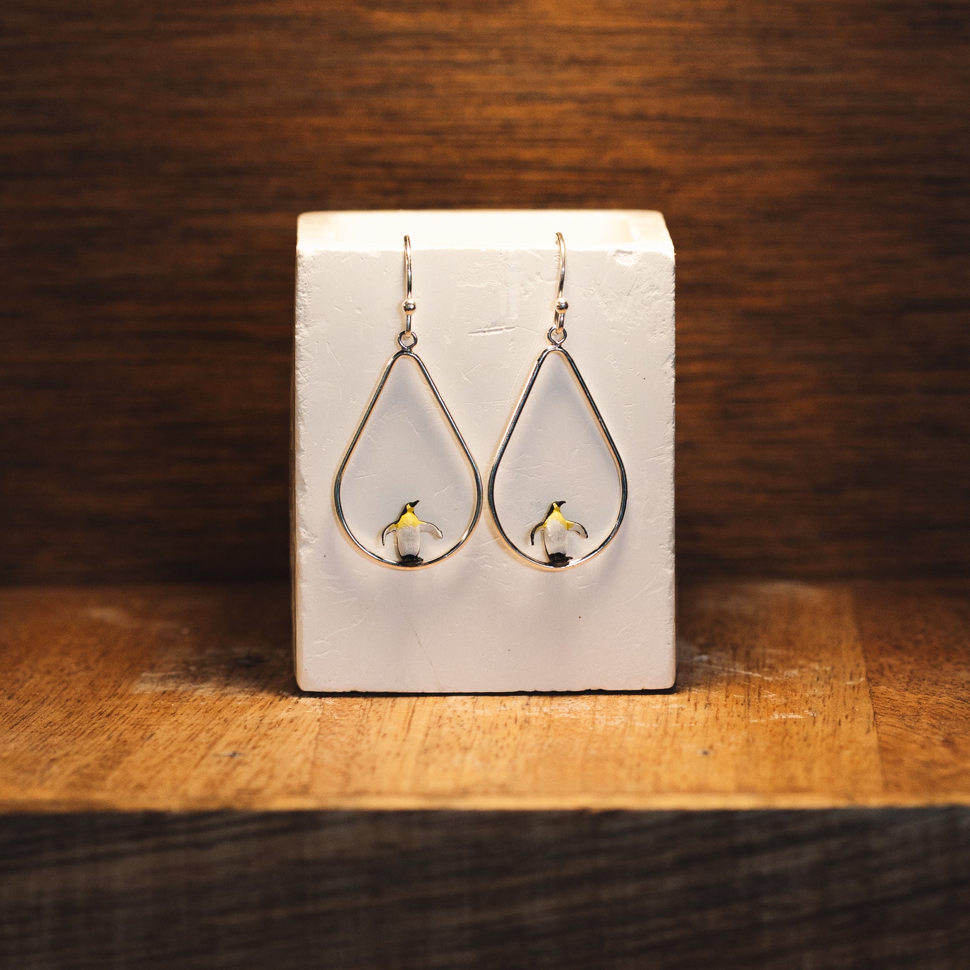 Hand-made sterling silver earrings featuring individually selected, hand-painted tiny penguins.